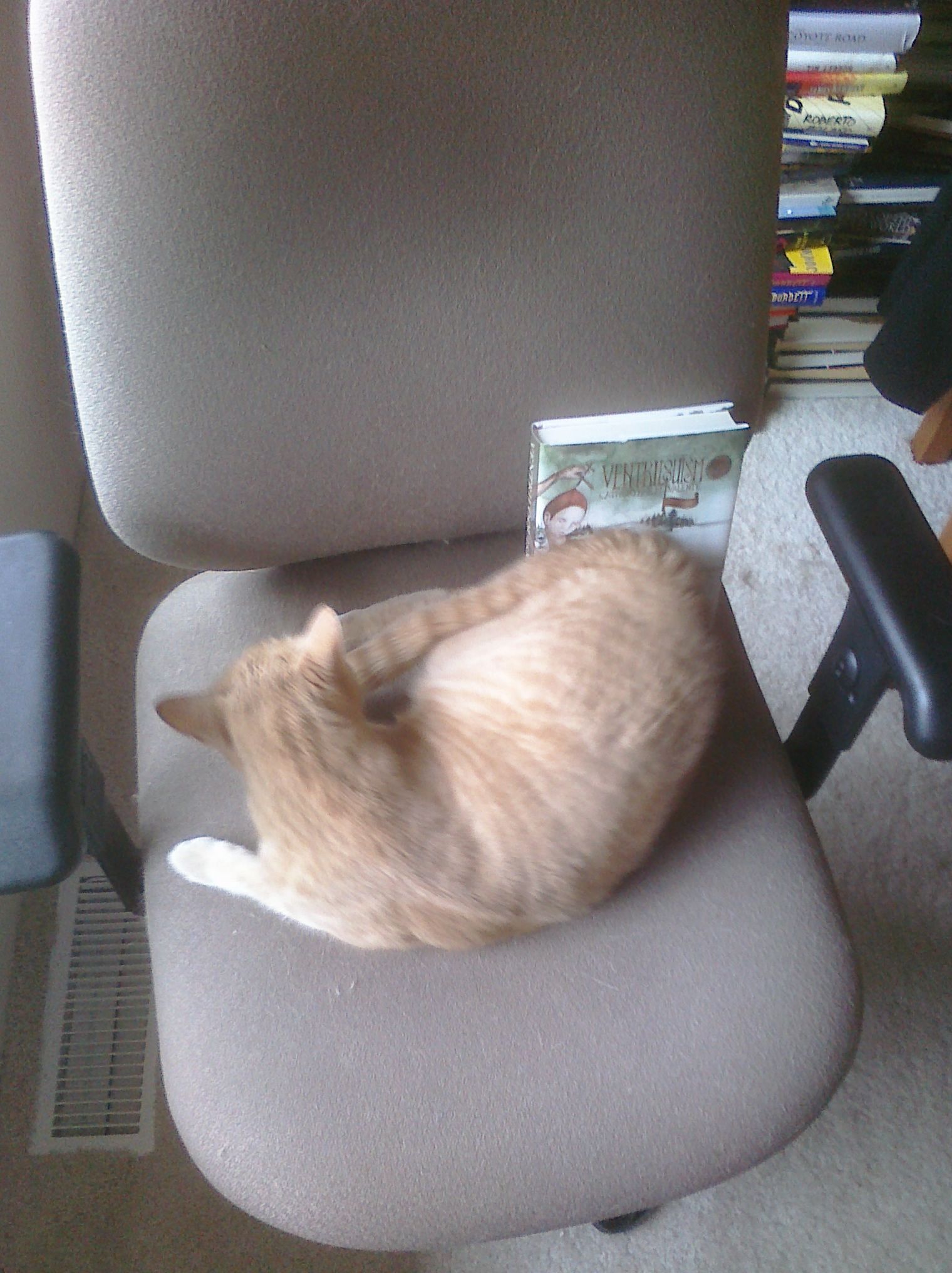 Cultured kitty reads Apocrypha and looks vaguely majestic-ish.
